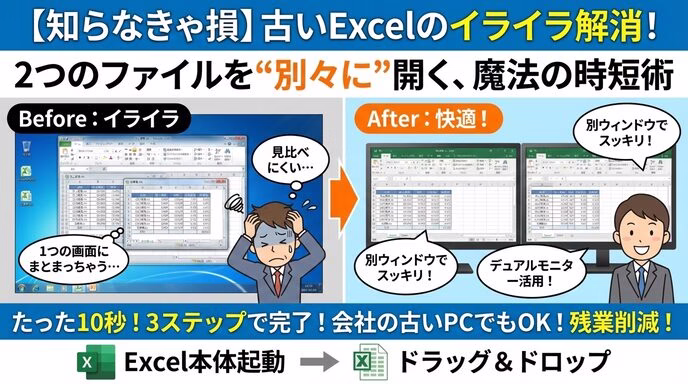 もし、あなたが「古いExcelだから仕方ない」と諦め、非効率なウィンドウ操作に貴重な時間を奪われているなら、この記事はあなたの救世主となります。