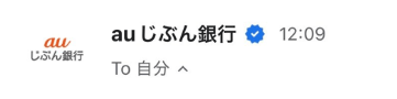 今回のメール画像では、表示名は「auじぶん銀行株式会社」になっているのに、実際の送信元アドレスは